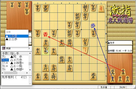 形勢判断は 76手目 先手有利 ( 412) 77手目 先手有利 ( 400) 78手目