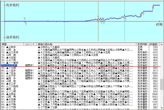 次の 78手目 本譜では△2五歩 (赤)で激指のコメントでは 疑問手 先手有利