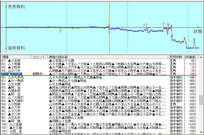 次の 84手目 本譜では ▲5五角 (赤)で激指のコメントでは 疑問手 互角 ( 130)