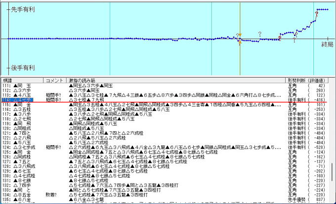 なお、本譜 115手目 ▲4七同金 の形勢判断は 互角 ( 101) となっています。 |