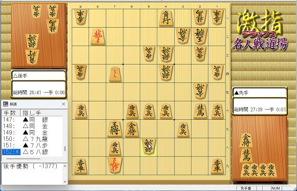 152手目 △5八銀 での激指の形勢判断 後手優勢 ( -1377) となています。