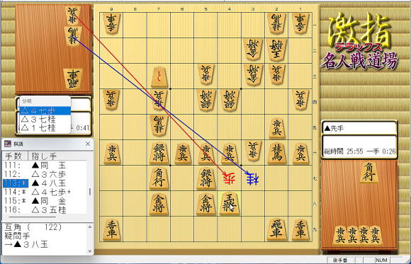 下記は 113手目 ▲4八玉 と王手を逃げた局面です。