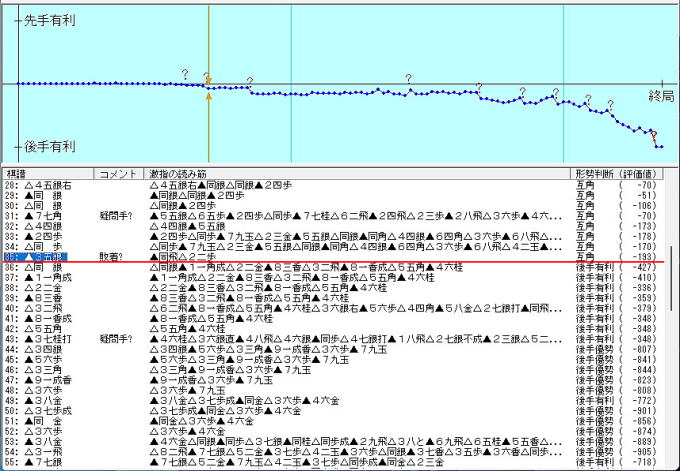なお、本譜 36手目 △3五同銀 の形勢判断は 後手有利 ( -427) となっています。 |