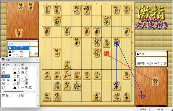 次の本譜 35手目 ▲3五銀 (赤) でしたが、激指のコメントでは 敗着