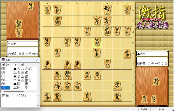70手目 △4四同歩 での激指の形勢判断 互角 ( -226) となています。