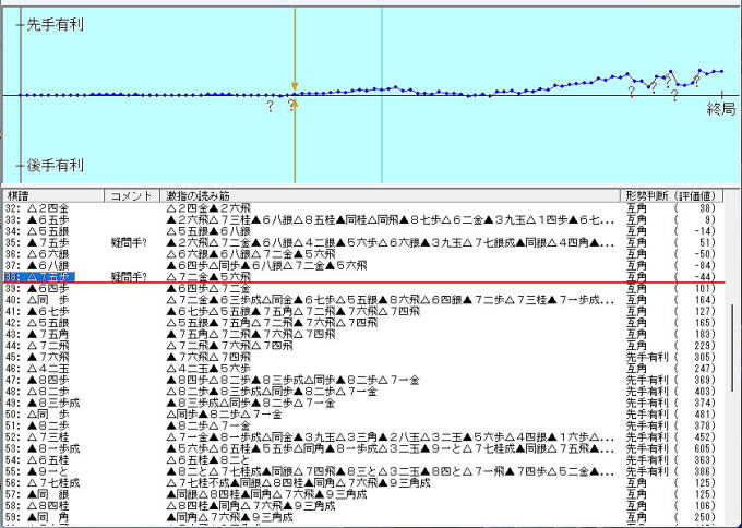 次の本譜 38手目は △7五歩 (赤) でしたが、激指のコメントでは 疑問手