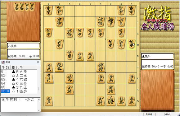 66手目 △1四歩 での激指の形勢判断 後手有利 ( -342) となています。