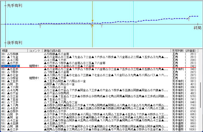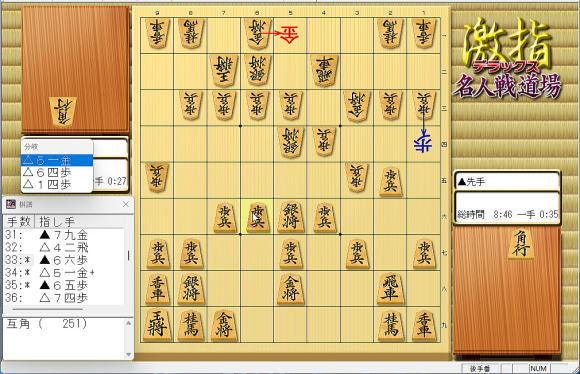なお、本譜 35手目 ▲6五歩 の形勢判断は 先手有利 ( 343) となっています。 |
