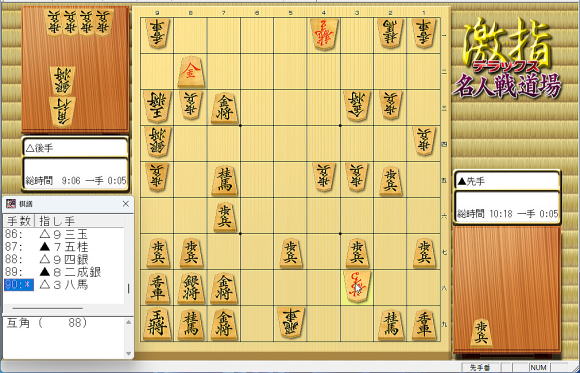 90手目 △3八馬 の 形勢判断 互角 ( 88) となっています。