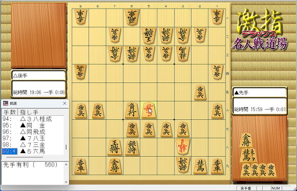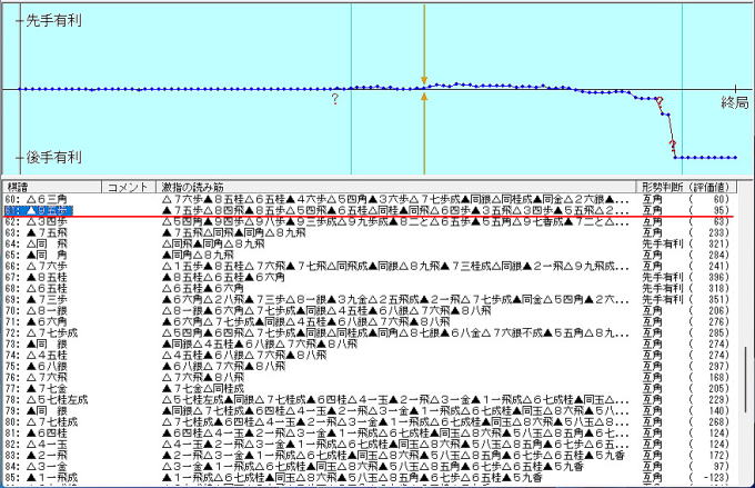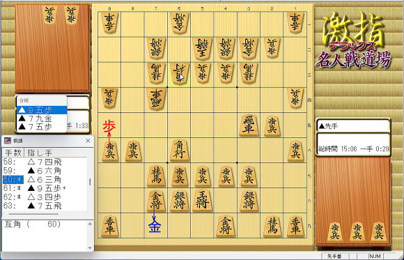 下記は 60手目 △6三角 と引いた局面です。 形勢判断 互角 ( 60)