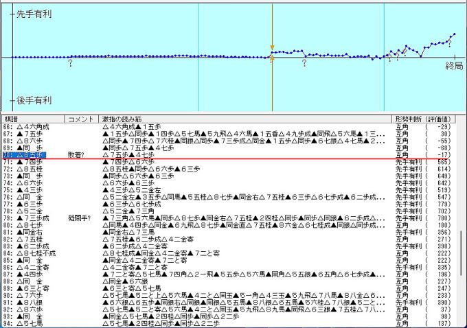 本譜71手目 ▲7四歩 の形勢判断は 先手有利 ( 565) に変わりました。 |