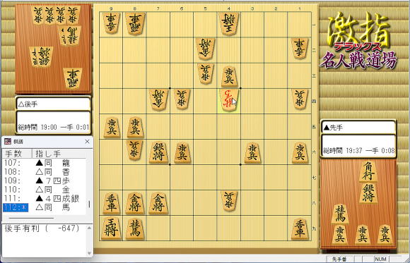 112手目 △4四同馬 の形勢判断は 後手有利 ( -647) となっています。