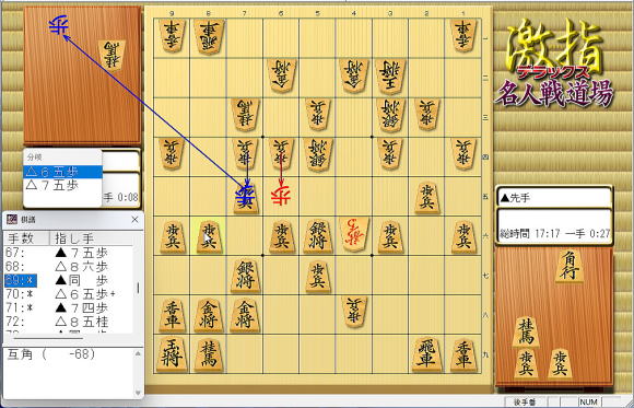 下記は @ △7五歩 に変えて激指の機能で指し進めた棋譜です。 |
