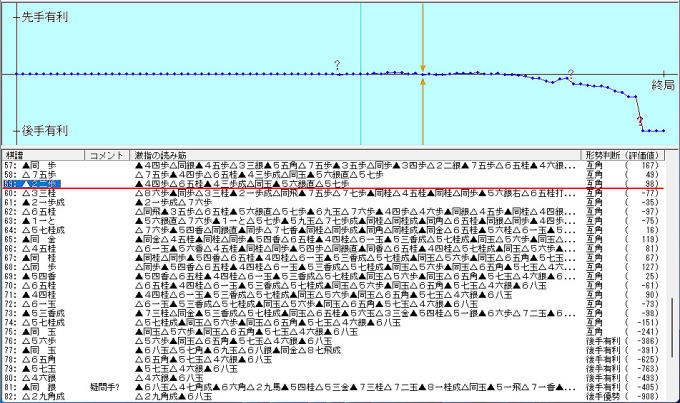 本譜 60手目 △3三桂 の形勢判断は 互角 ( -77) に変わりました。 |