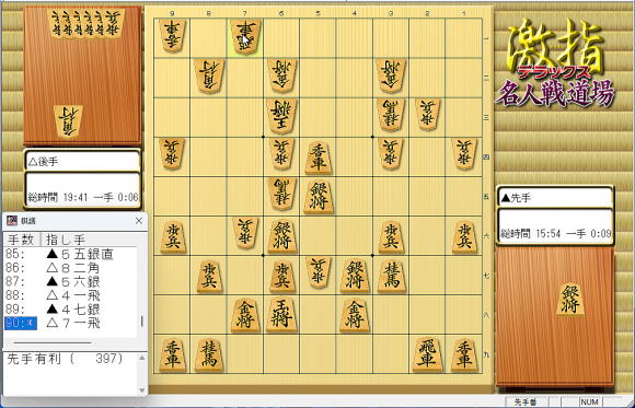 90手目 △7一飛 の形勢判断は 先手有利 ( 397) となっています。