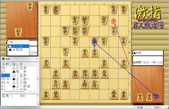 次の本譜 59手目 ▲2二歩 (赤) は 激指のコメントはありませんが、感想戦では上がって