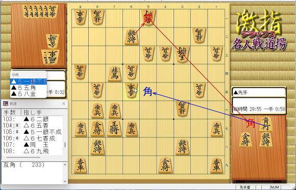 下記は ▲5五角 に変えて激指の機能で指し進めた棋譜です。 |