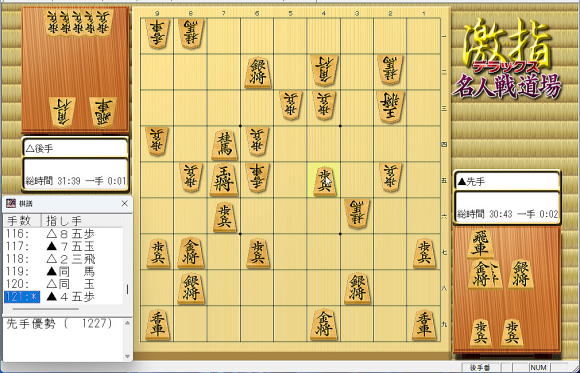 121手目▲4五歩 の形勢判断は 先手優勢 ( 1227)となっています。